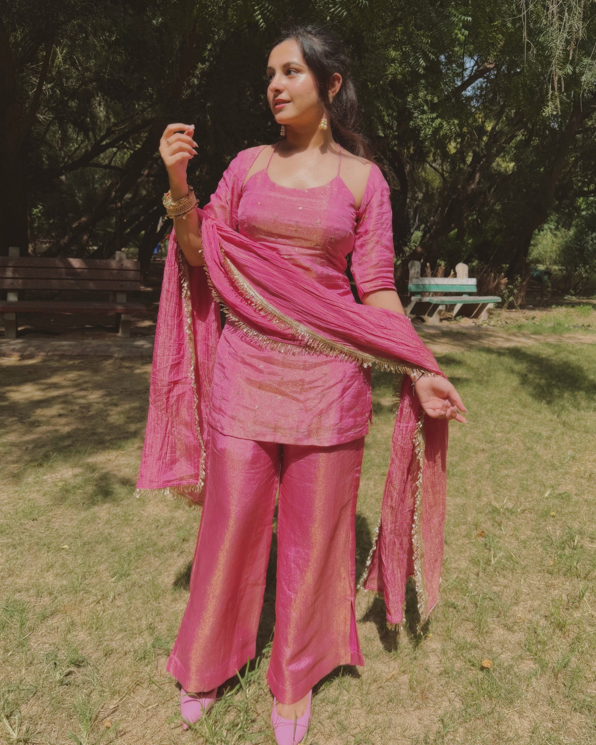 A dreamy pink statement set that channels playful Barbie vibes with a chic modern twist.